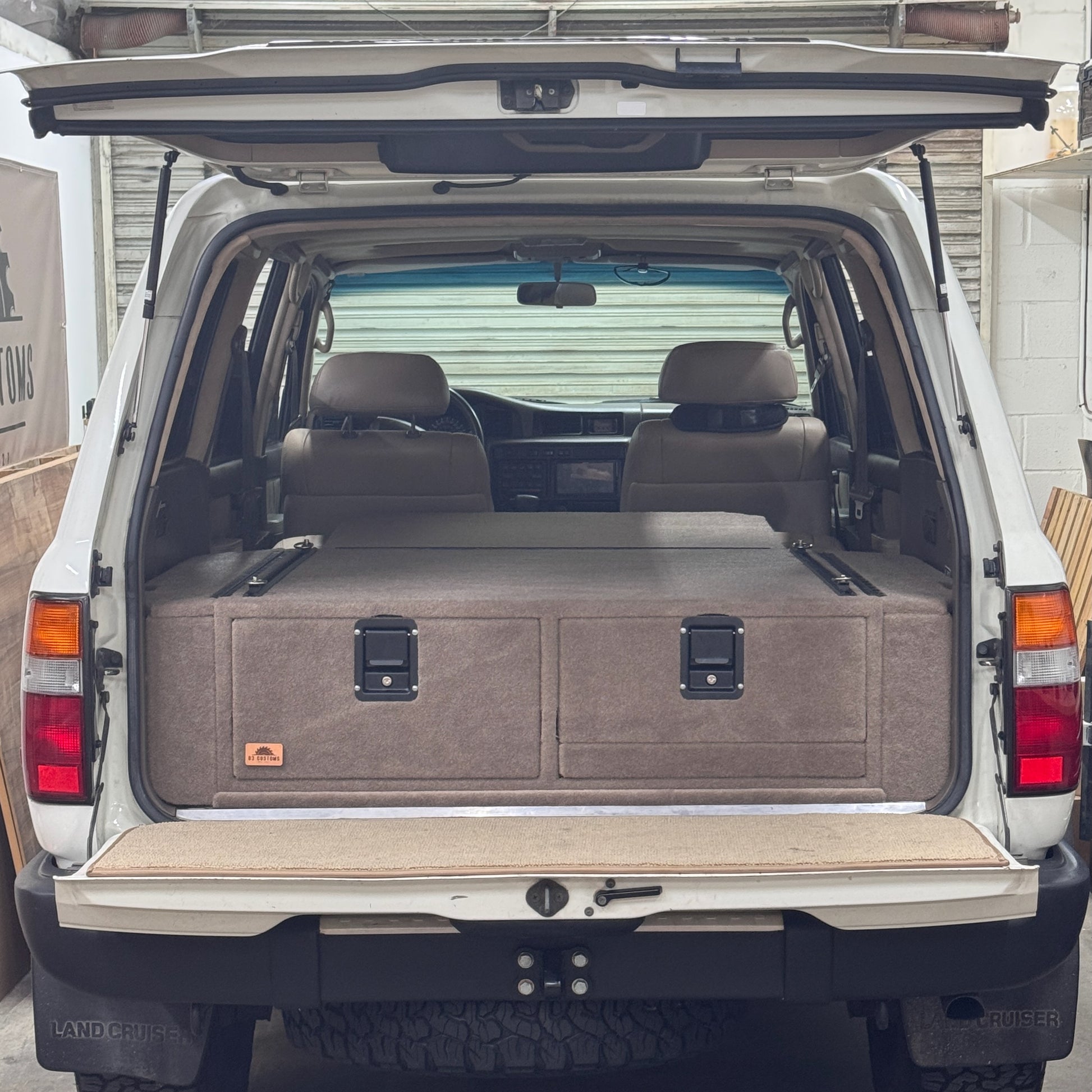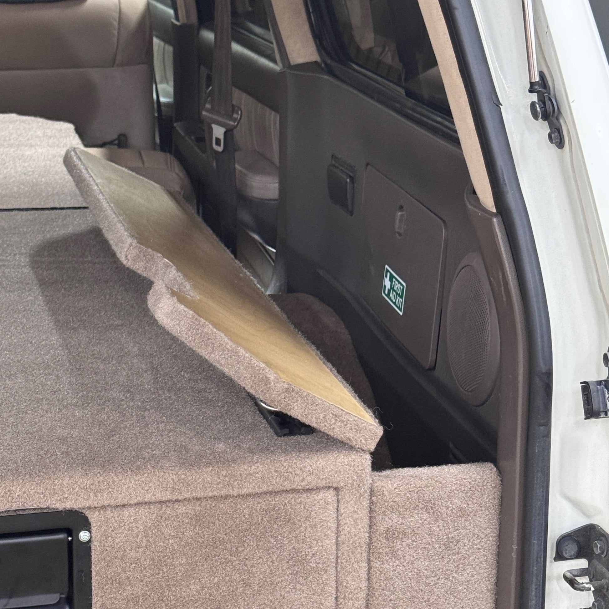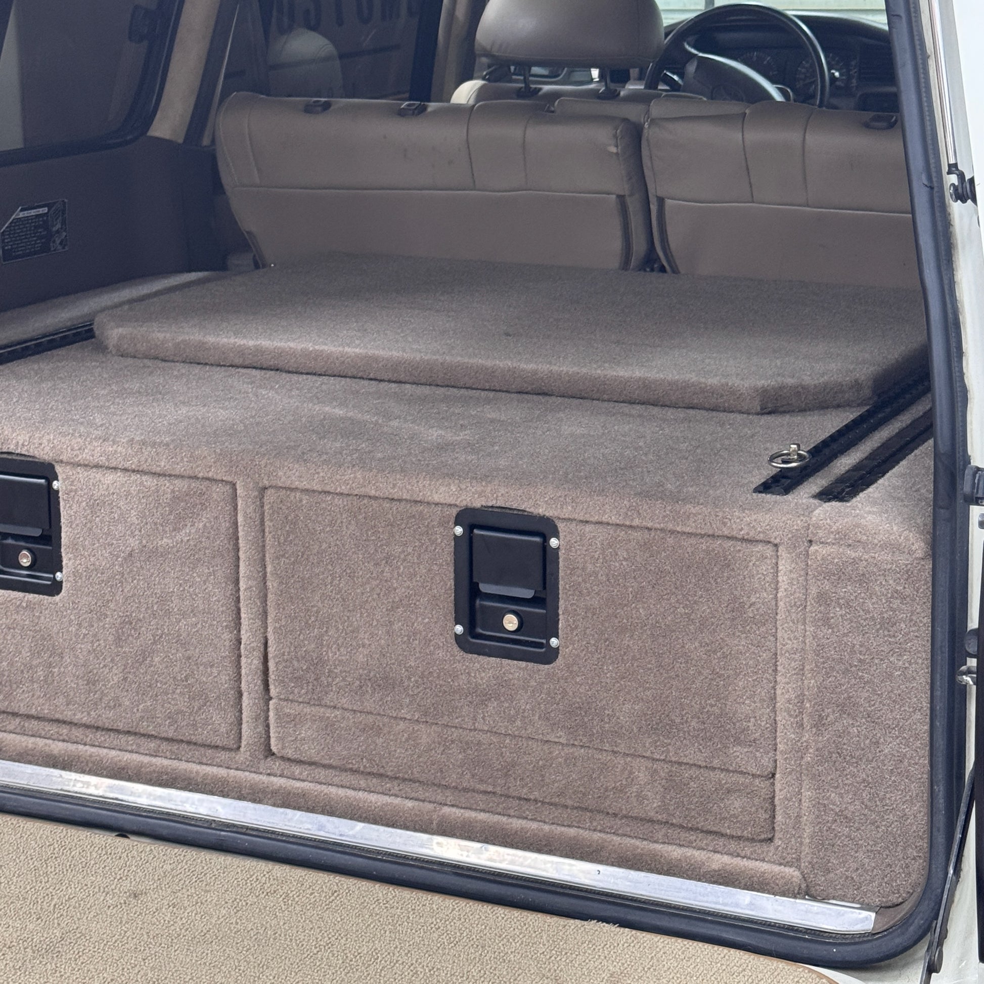 These quickly detachable sleeper platforms cover the rear seats and match the height of your drawer systems to create perfectly flat space for the ideal overlanding experience. Through fold down legs, these platforms aren’t only secure but also stow away nicely. These platforms also have room underneath to provide additional space for storing items while you use the space above.
