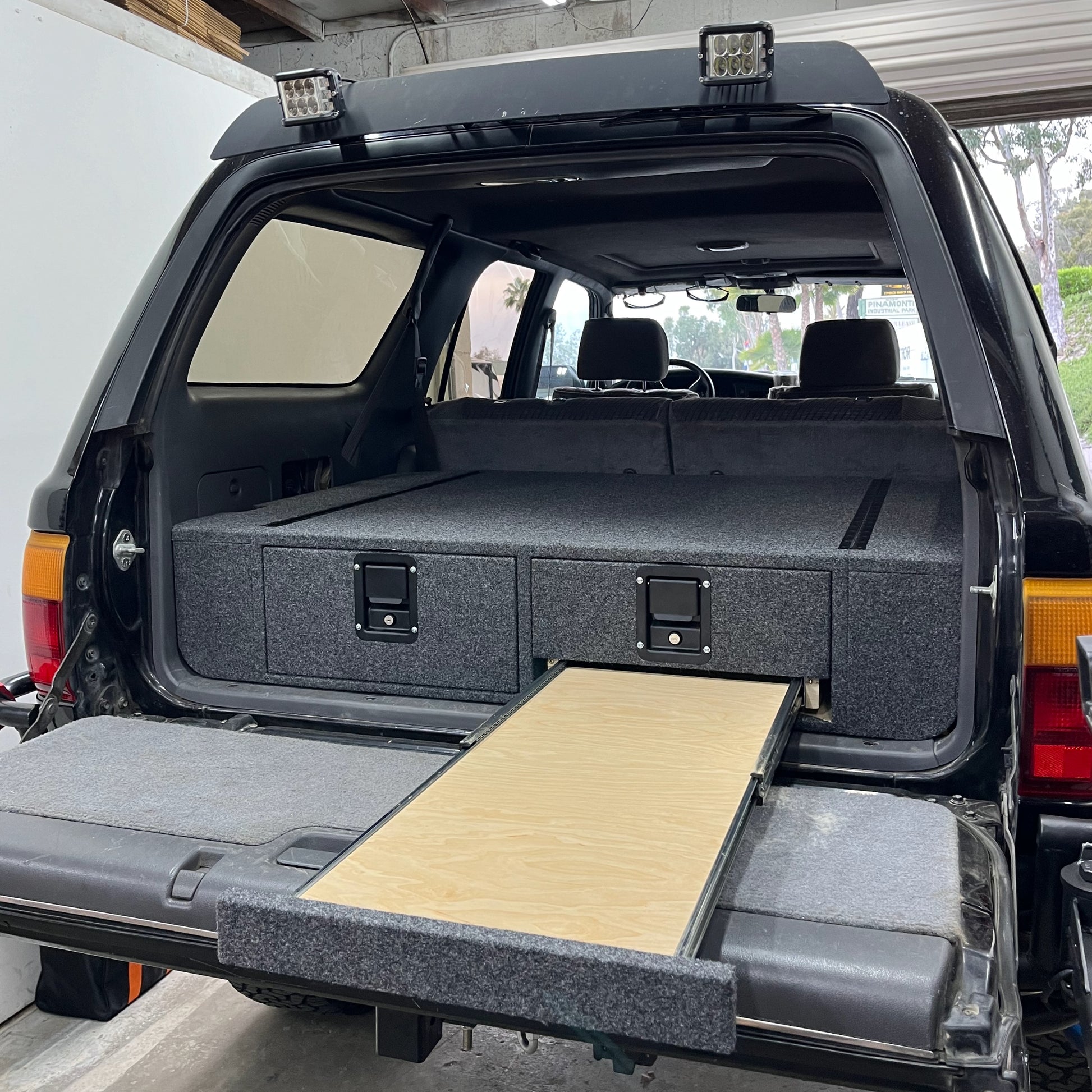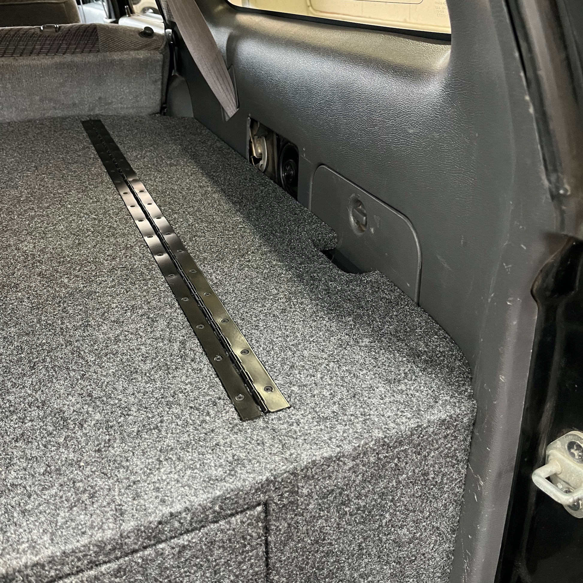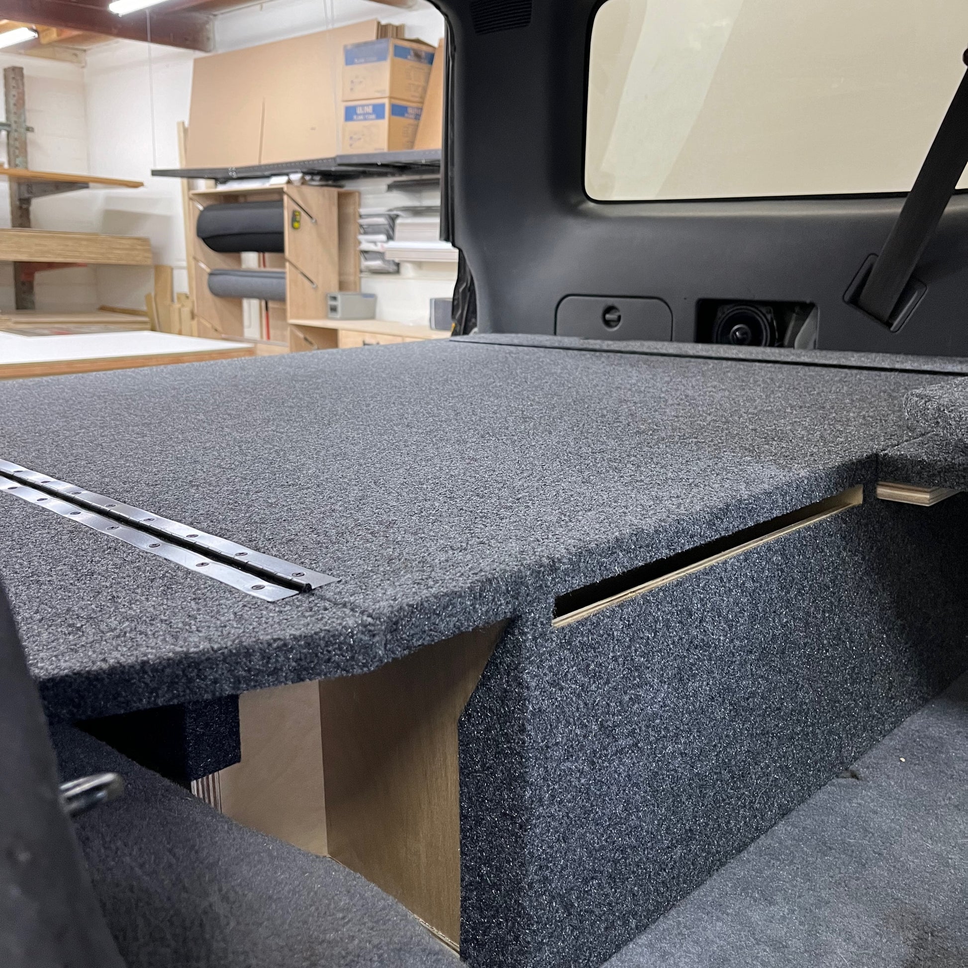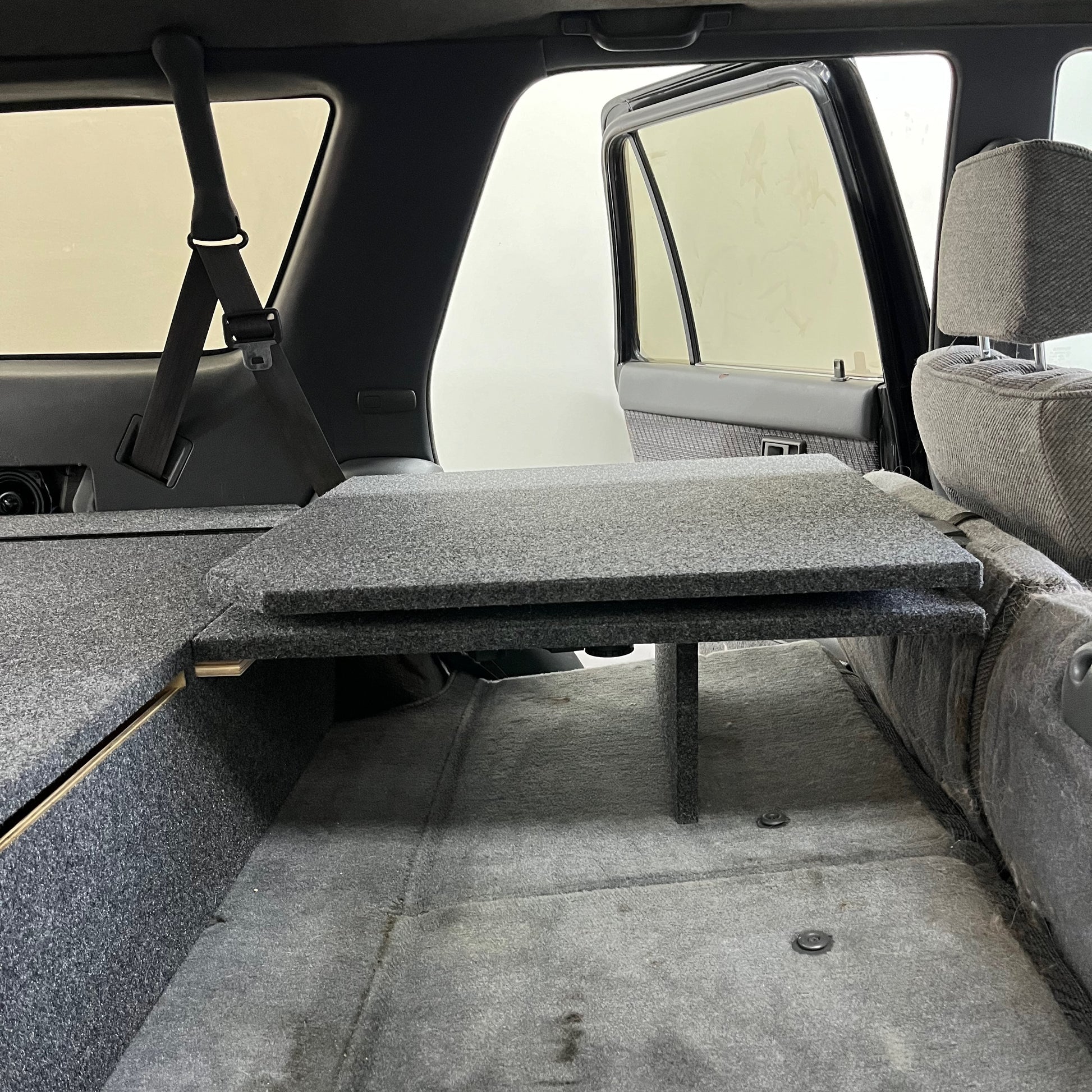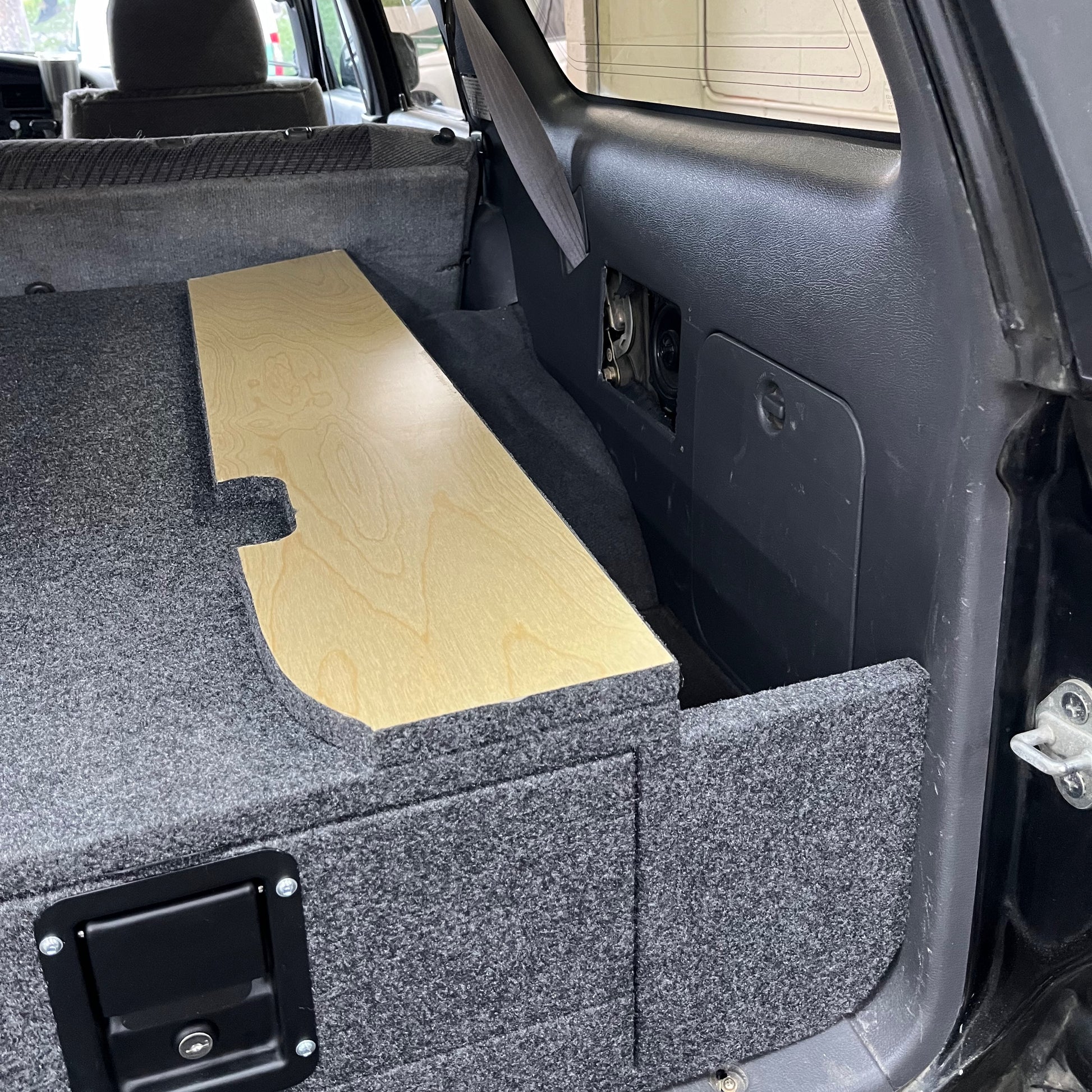 These quickly detachable sleeper platforms cover the rear seats and match the height of your drawer systems to create perfectly flat space for the ideal overlanding experience. Through fold down legs, these platforms aren’t only secure but also stow away nicely. These platforms also have room underneath to provide additional space for storing items while you use the space above.