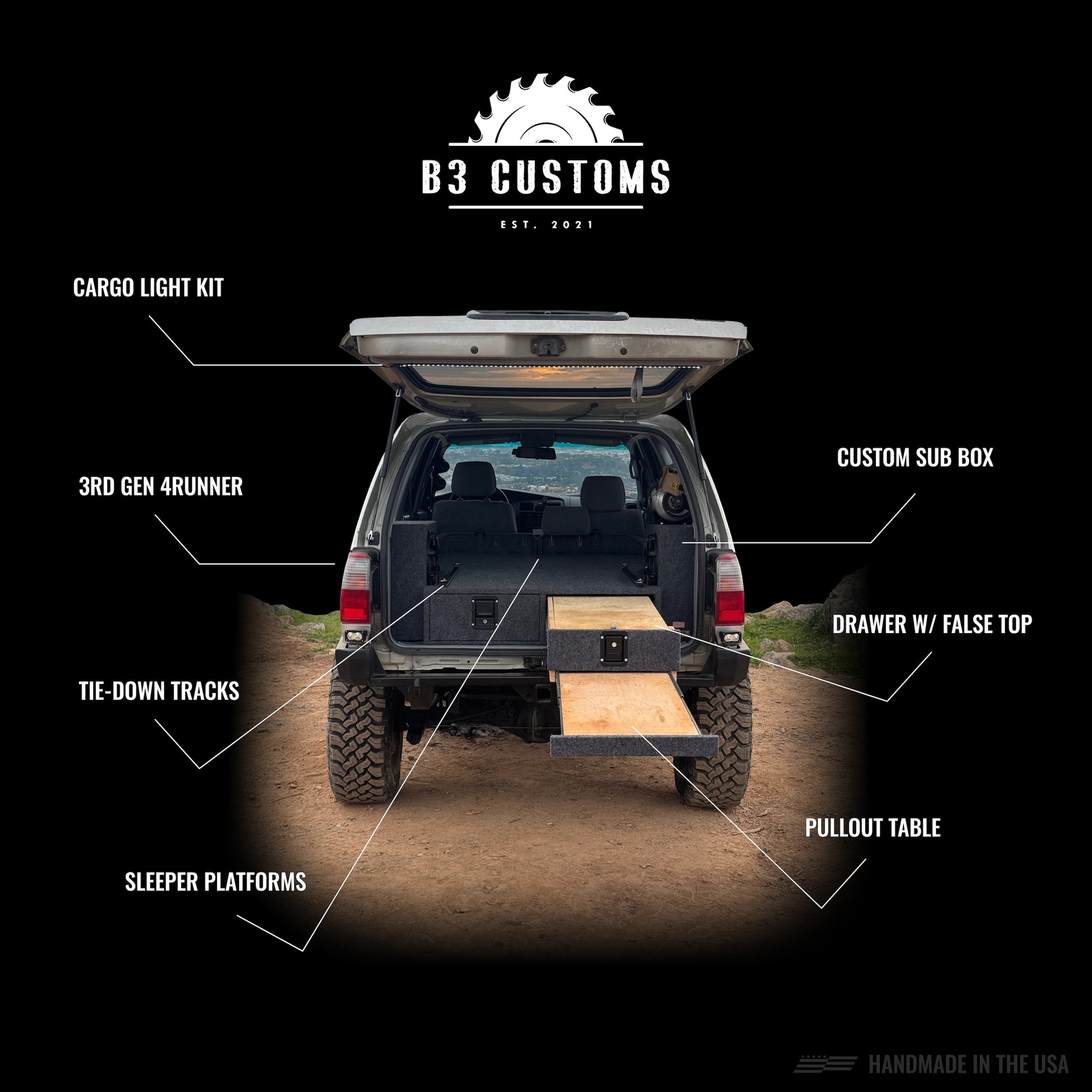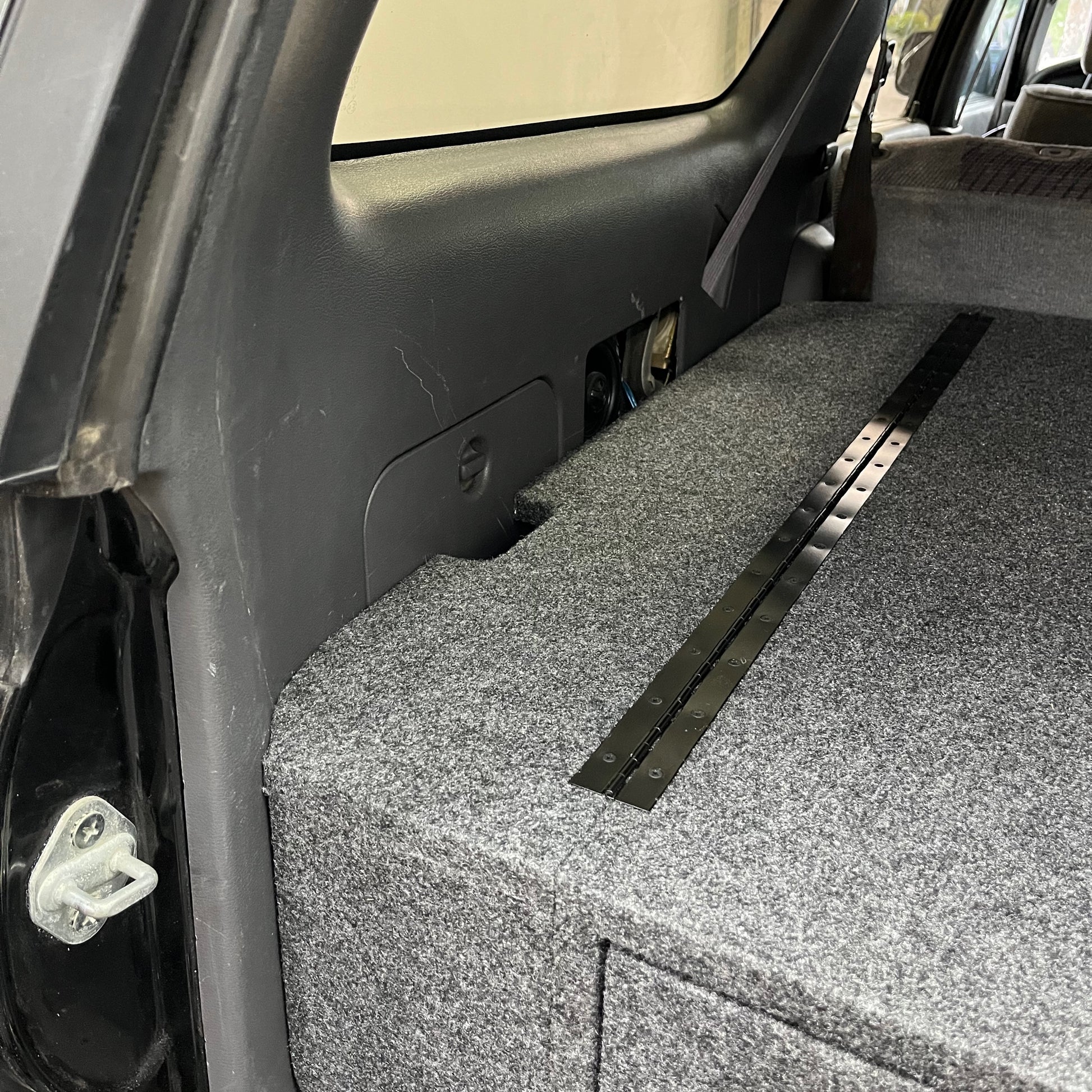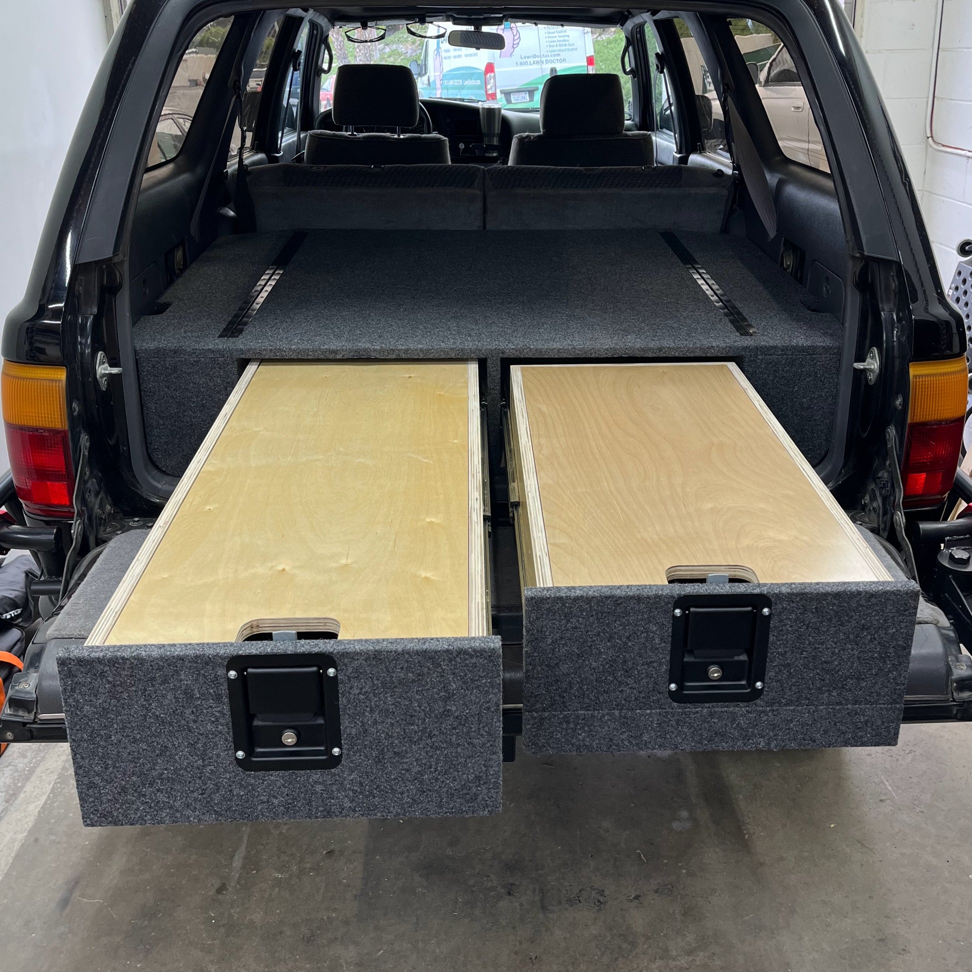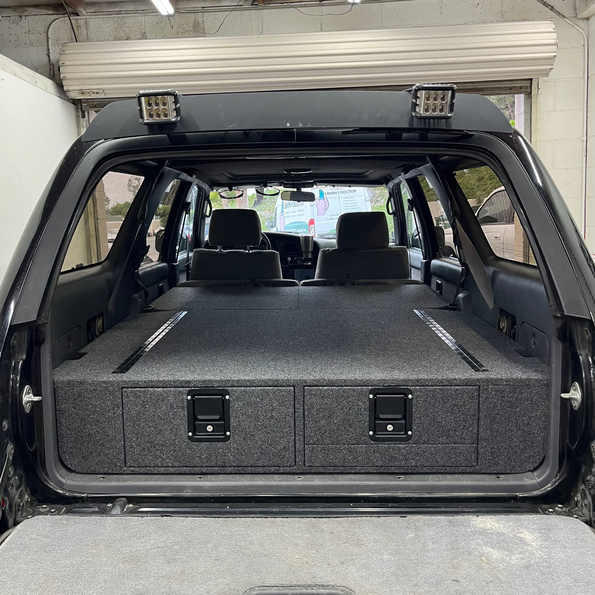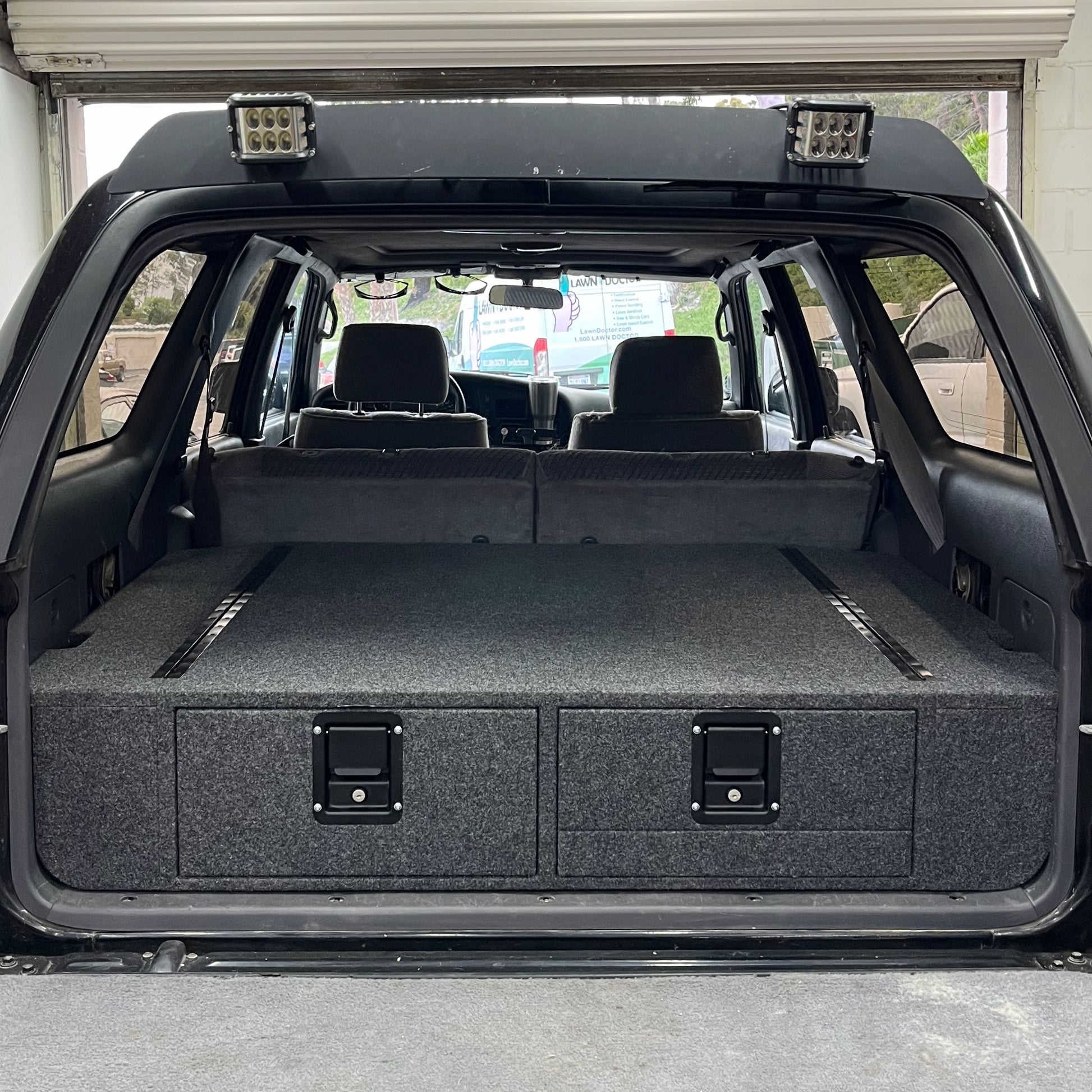 These quickly detachable sleeper platforms cover the rear seats and match the height of your drawer systems to create perfectly flat space for the ideal overlanding experience. Through fold down legs, these platforms aren’t only secure but also stow away nicely. These platforms also have room underneath to provide additional space for storing items while you use the space above.